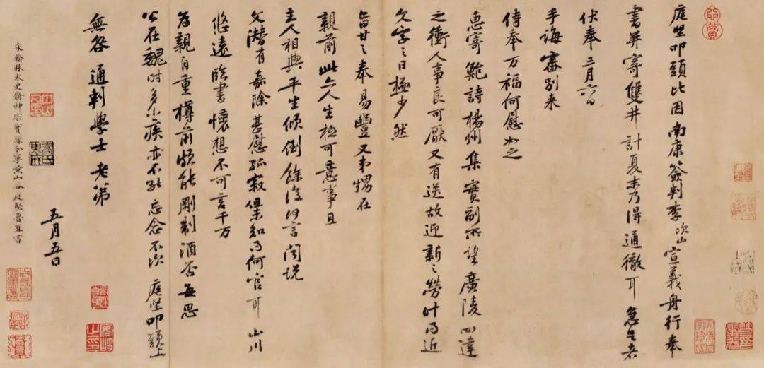 惠寄鲍诗、杨(扬)州集。实副所望。广陵四达之冲。人事良可厌。又有送故迎新之劳。计得近文字之日极少。然旨月‘之奉易丰。又弟甥在亲前。此亦人生极可意事。且主人相与。平生倾倒。徐复何言。闻说文潜有嘉除。甚慰孤寂。但未知得何官耳。山川悠远。临书怀想不可言。千万为亲自重。搏前颇能刚制酒否。每思公在魏时多小疾。亦不能忘念。不次。庭坚叩头。上无咎通判学士老弟。五月五日。