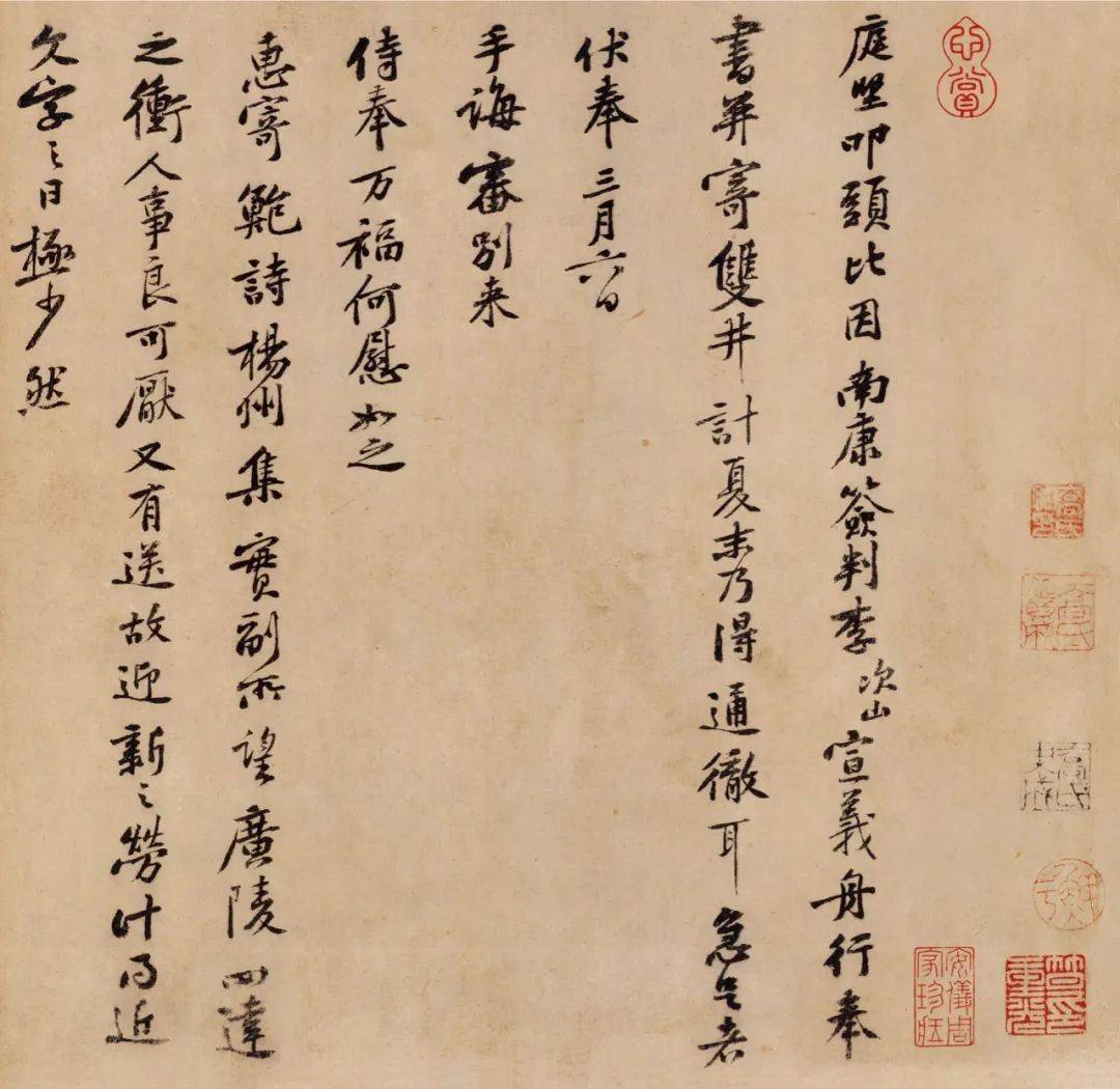 释文:庭坚叩头。比因南康签判李次山宣义舟行。奉书。并寄双井。计夏末乃得通彻耳。急足者伏奉三月六日手诲。审别来侍奉万福。何慰如之。