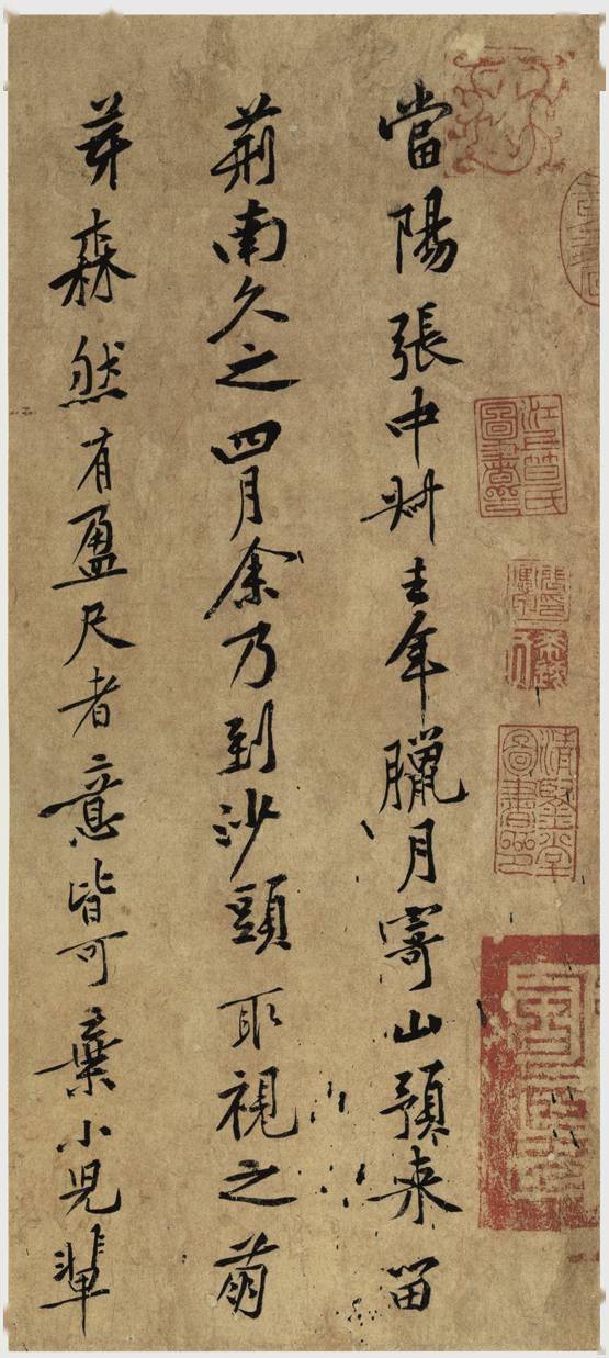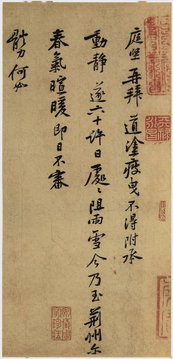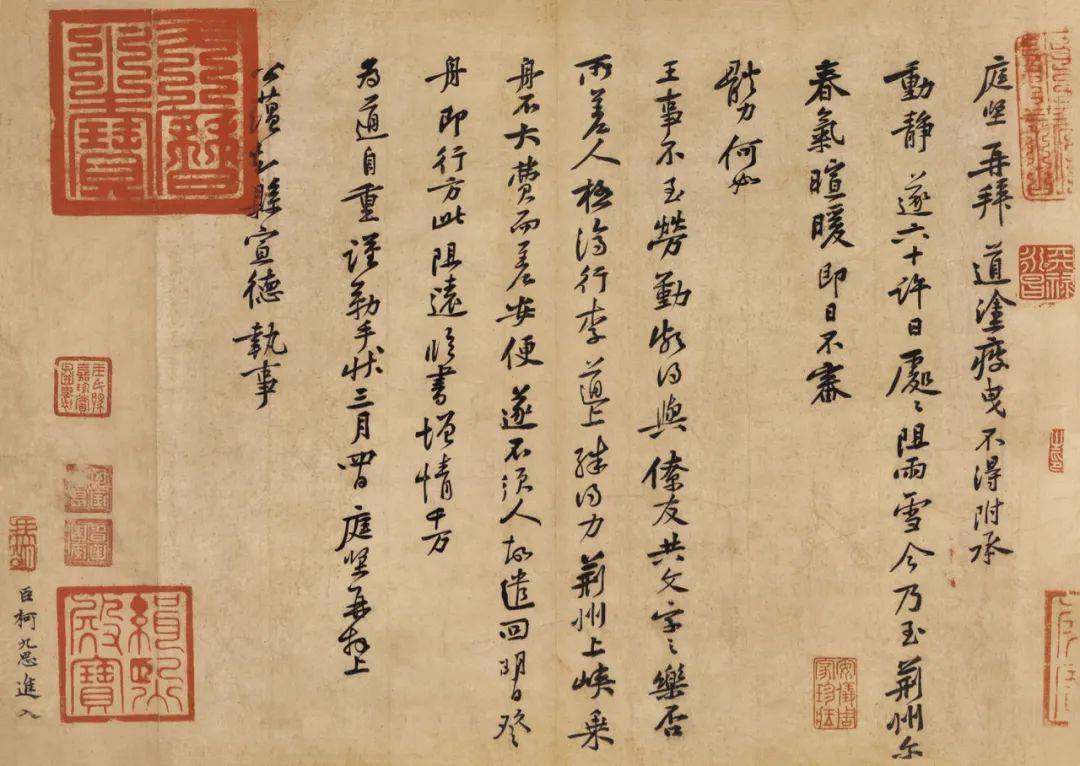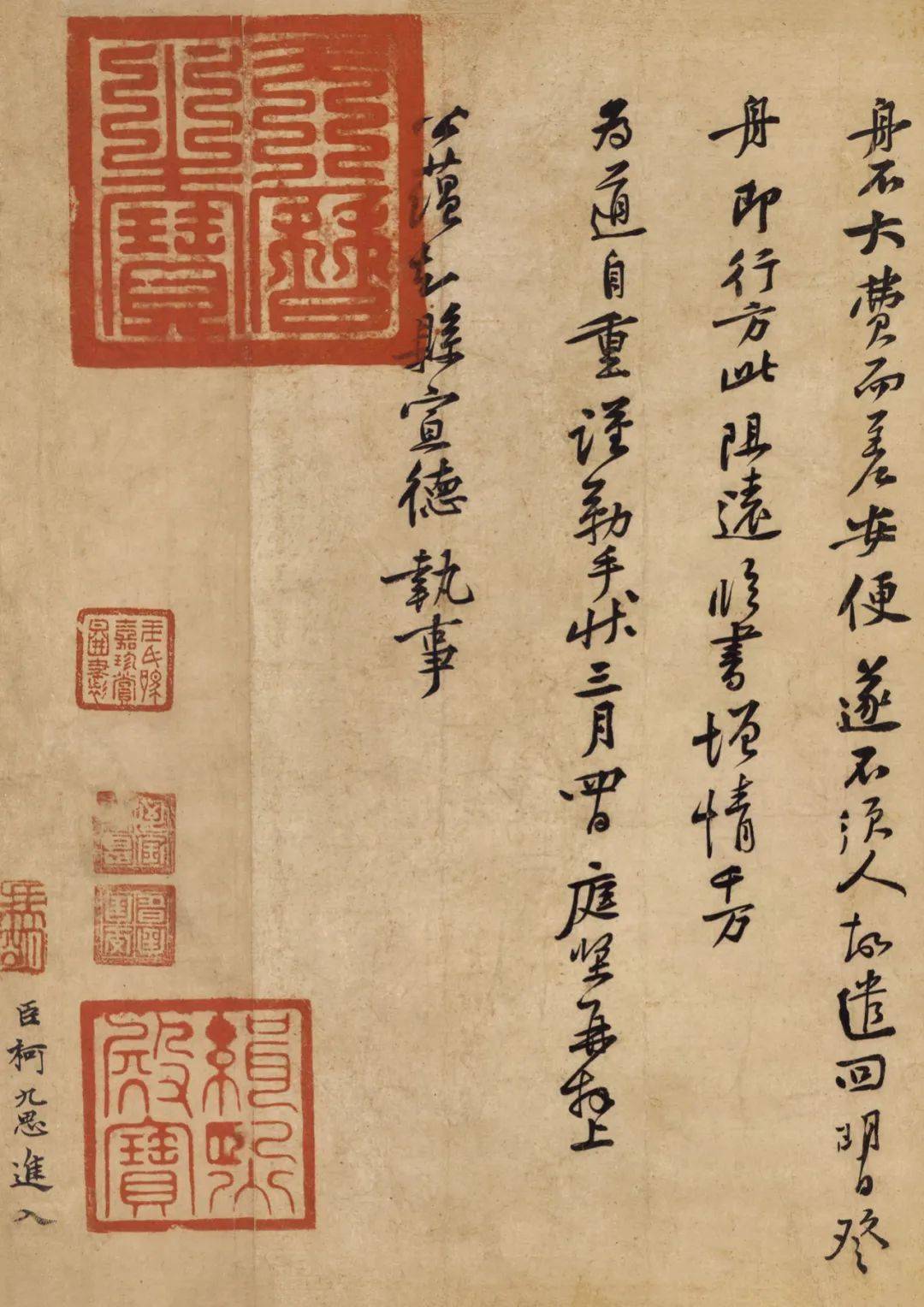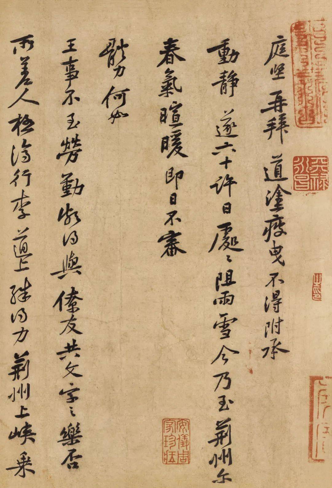 释文:庭坚再拜,道涂疲曳,不得附承动静。遂六十许日,处处阻雨雪,今乃至荆州尔。春气暄暖即日不审体力何如?王事不至劳勤,颇得与僚友共文字之乐否?所差人极济,行李道上殊得力。荆州上峡,乘舟不大费而差安便。遂不须人,故遣回。明日登舟即行,方此阻远,临书增情,千万为道自重。谨勒手状,三月四日,庭坚再拜上。公蕴知县宣德执事。