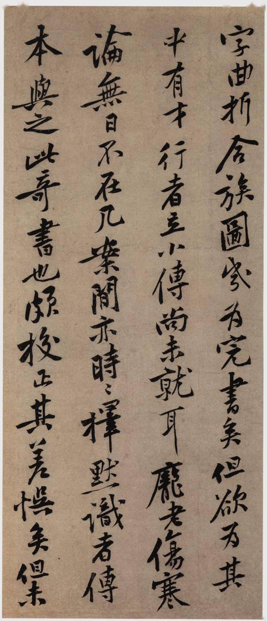 释文:庭坚顿首,承见谕,早尝过此,延伫甚久,何以不至耶。雪寒,安胜否?大轴今送,然勿多示人,或不解此意亦来索,匠石斫鼻则坐困矣。庭坚顿首。明叔少府同年家。