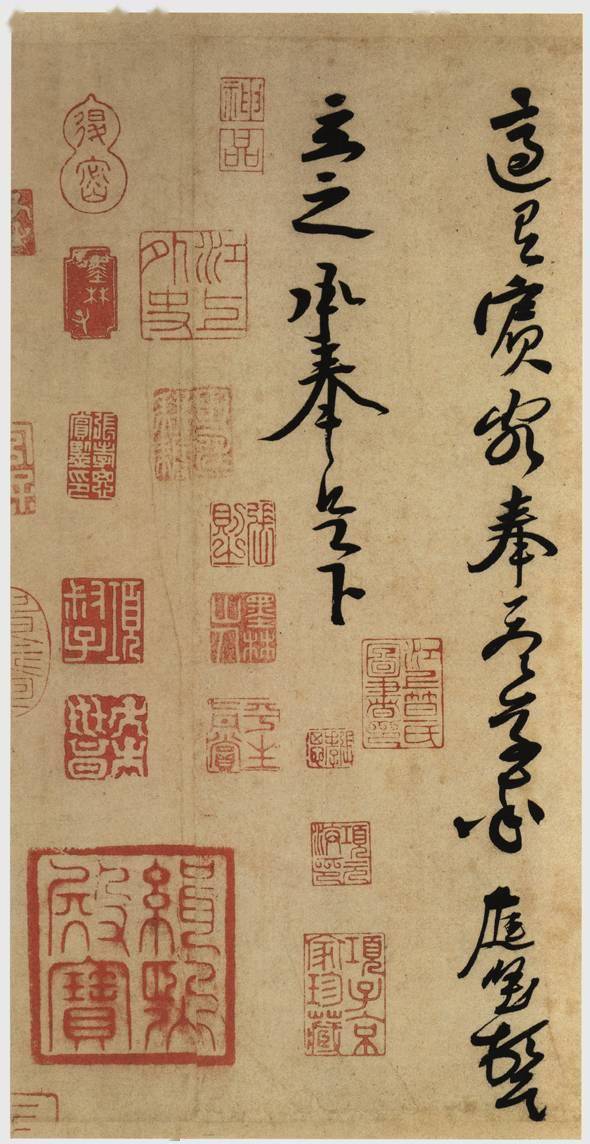释文:庭坚顿首,承惠糟姜银杏,极感远意,雍酥二斤,青州枣一蔀,漫将怀向之勤,轻渎不罪,庭坚顿首。