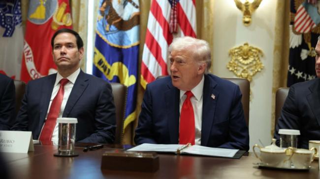 美国总统川普正计划设立“乌克兰胜利基金”,资金来源来自对中国征收的新关税。图为2025年10月9日,美国总统川普与国务卿卢比欧在白宫内阁会议上。川普就以哈停火协议发表讲话,并表示人质可能在下周获释。(Anna Moneymaker/Getty Images)