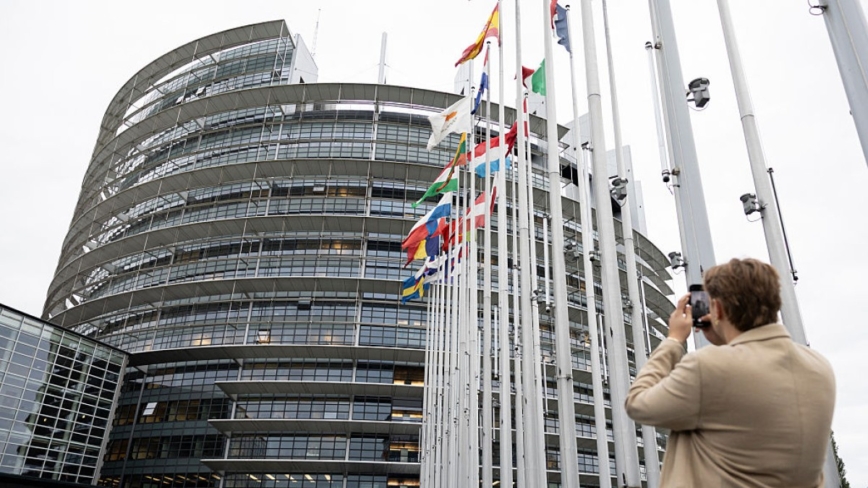 2025年10月6日,一名男子拍摄位于法国东部史特拉斯堡的欧洲议会大楼。(ROMEO BOETZLE/AFP via Getty Images)