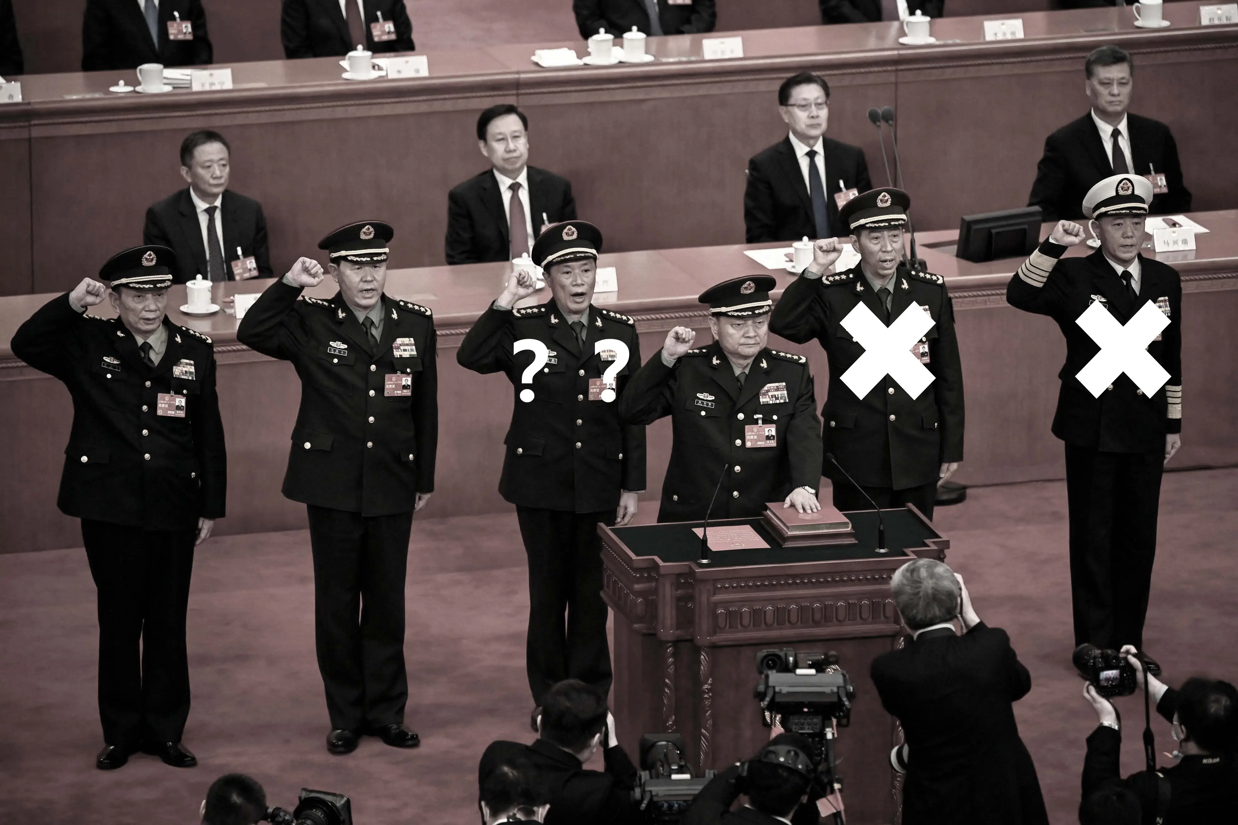 2023年3月11日,中共军委委员在人大会议上宣誓,右侧的苗华、李尚福已被罢免,中间的何卫东下落不明。