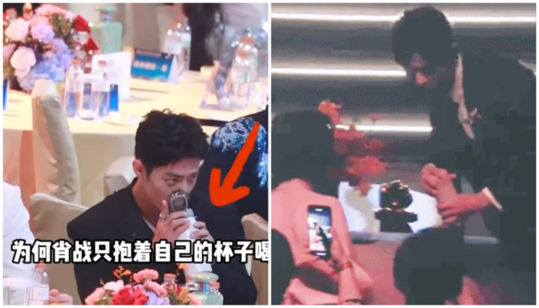 肖战不喝提供的酒水,自带保温杯。新浪微博之夜的颁奖典礼后,朝郑爽要回了自己的保温杯(右图)。(网络图合成)