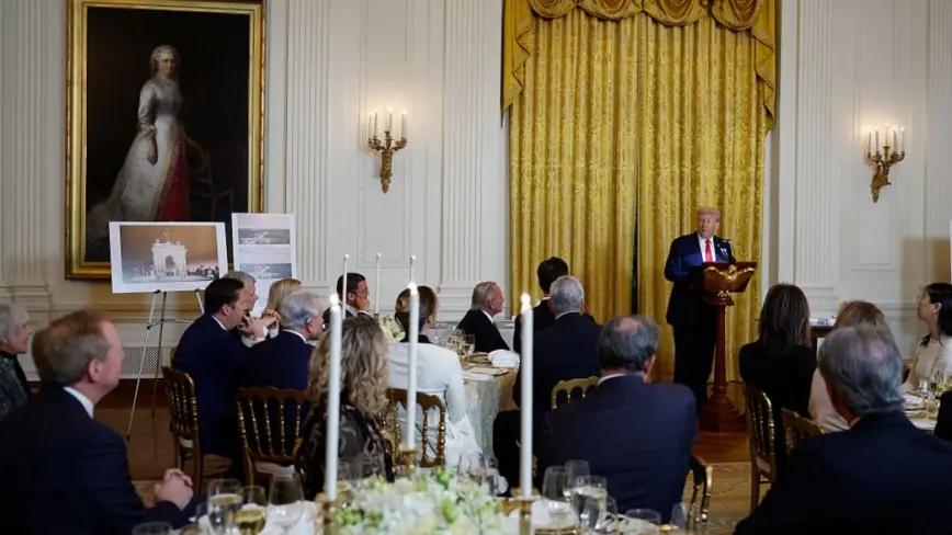 周三(10月15日),美国总统川普在白宫举行了一场筹款晚宴,款待捐款修建白宫宴会厅的企业高层。包括亚马逊、苹果、微软、谷歌、洛克希德马丁在内,20多家商业巨擘都派代表出席。