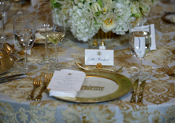 2025年10月15日,美国总统川普在白宫东厅的宴会厅筹款晚宴上摆放的餐位。(Kevin Dietsch/Getty Images)