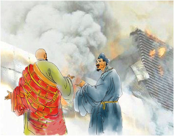 这时,已是正晌午时。突然刮起一阵大风。风刮幡动,挂在大殿里的幡,轻轻一摆,恰好覆到正在燃烧的蜡烛上,一下子着起火来。火势顺着幡布,直窜上大梁,大殿里顿时浓烟滚滚,烈焰腾腾,好一场大火。全寺和尚提桶端盆,泼水救火,怎奈火势太猛,怎么抢救也来不及了,不一会儿,大殿便烧光了,只剩下了一个空架。众僧垂头丧气坐在那里。济公却摇着扇子边唱边踱了过来,住持见济公的样子,便大声呵斥道:”你还有点良心没有?大殿烧成这样了,你还有心唱歌?“