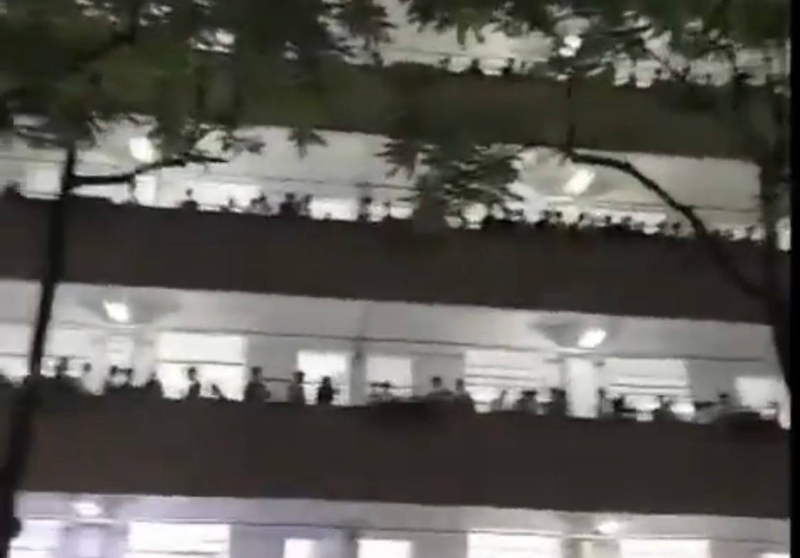 10月16日晚,全校数千名学生走出教室,聚集在校园内,还有许多学生站在教室前的走廊上,“抗议、抗议”的声音响彻校园。“现场有几千人,所有学生都跑出来了,喊着抗议的口号。”黄进说。