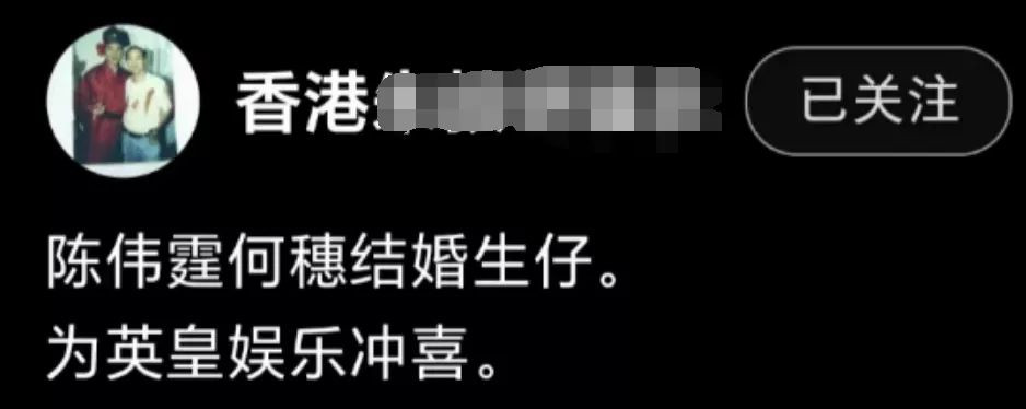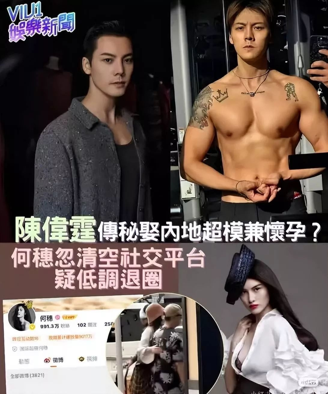 早在何穗八月份清空社交平台时,就有香港知名狗仔爆料她退圈的原因——和陈伟霆结婚并怀孕。狗仔还透露,二人分分合合在一起五年,这次之所以结婚,有部分原因是为了给英皇公司冲喜。