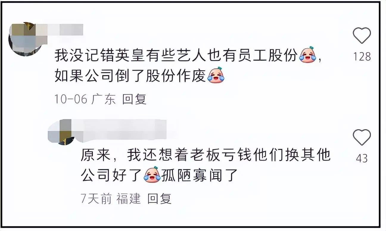 老板杨受成和员工的关系很好,甚至有传闻称,公司里的资深艺人绝大部分都有英皇的股份。如今公司负债一百多亿,如果倒闭了,那么这些股份也就全部作废,可想而知损失有多少。