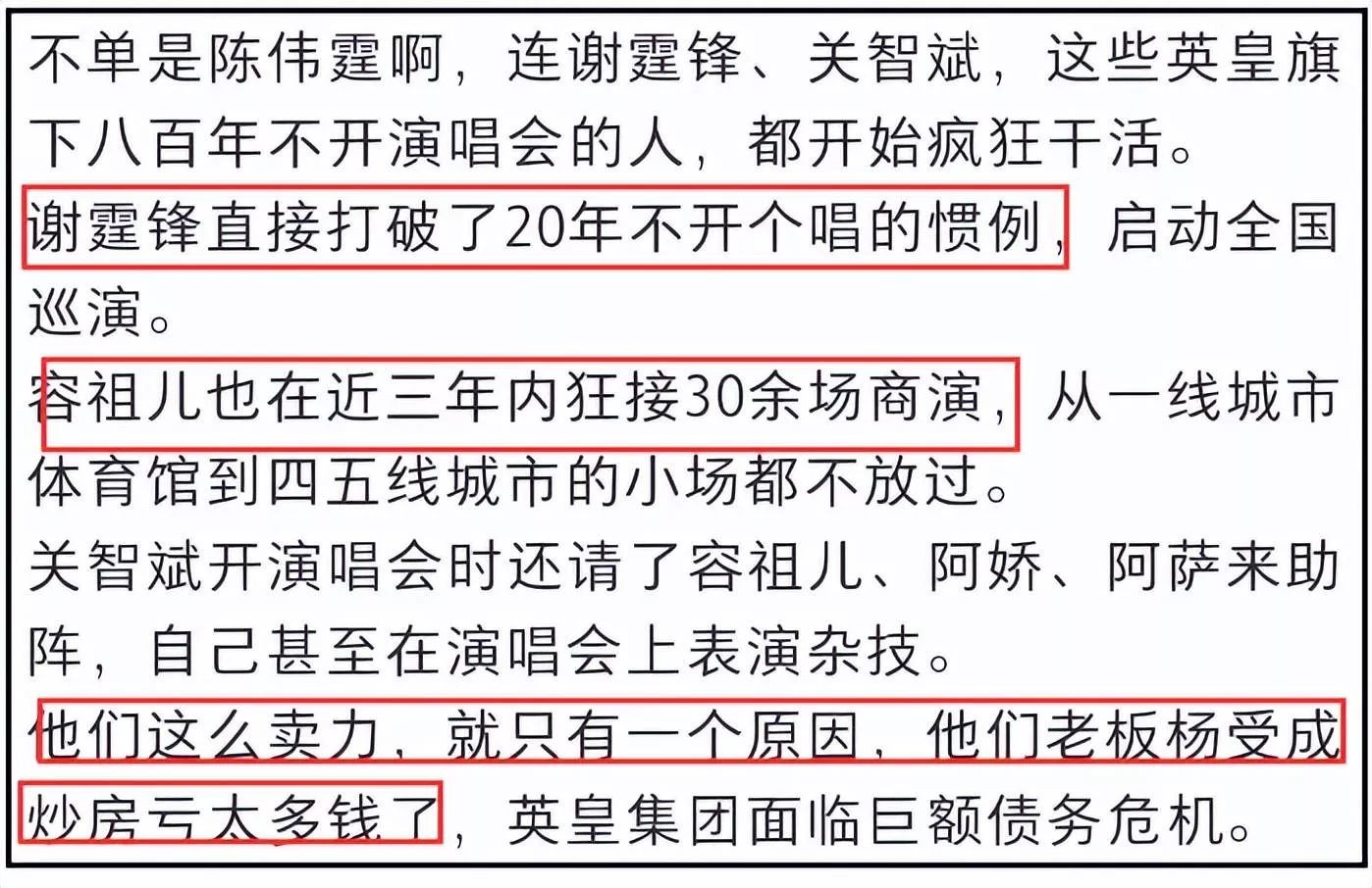 从这些发言就能看出来,陈伟霆对老板很感激。此外还有网友爆料,陈伟霆“一把年纪”之所以还频频来内地演偶像剧,就是为了拼命打工还债。且不仅仅是他,就连谢霆锋卖命开巡回演唱,容祖儿、阿娇、关智斌等人疯狂工作,全都是为了解决英皇的债务危机。