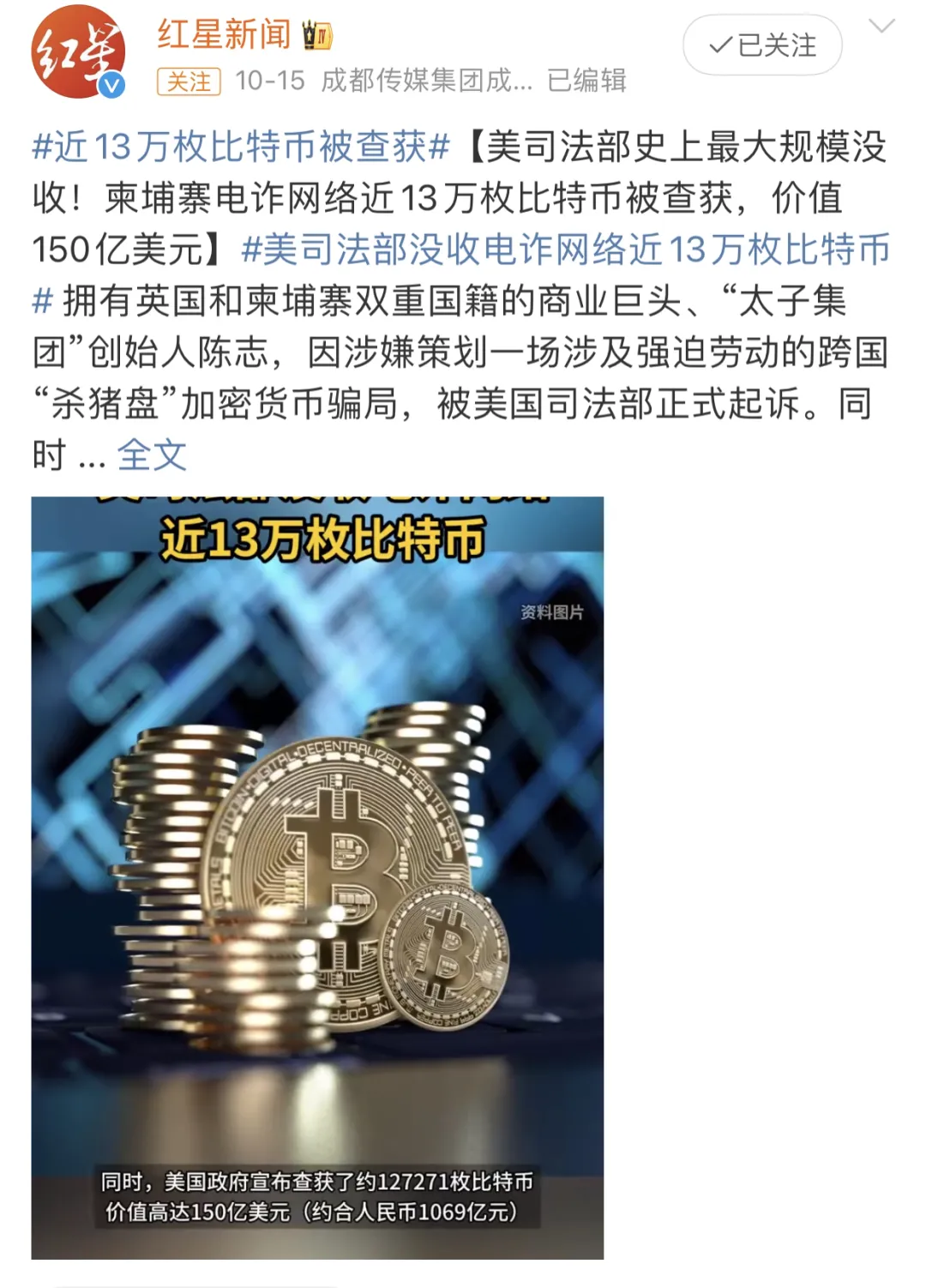 美国司法部和英国当局宣布,对柬埔寨“太子集团”创始人陈志提起联合诉讼,指控其操控一个庞大的跨国电诈网络,并冻结了高达127,271枚比特币的数字资产——按当前市值计算,约140亿美元。