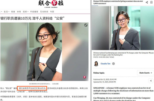 lenscn:中国小粉红曹某,在新加坡大华银行(UOB)任职,接到两位中国公安电话,让她“义务”协助中国调查客户。她没有通知银行上级,私下帮“中国公安”查询1100个银行客户的账户资料,严重侵犯客户隐私。没想到这两个中国公安拿这些资料搞网络诈骗。可笑的是,这位小粉红自己还也被公安骗了10万新币。