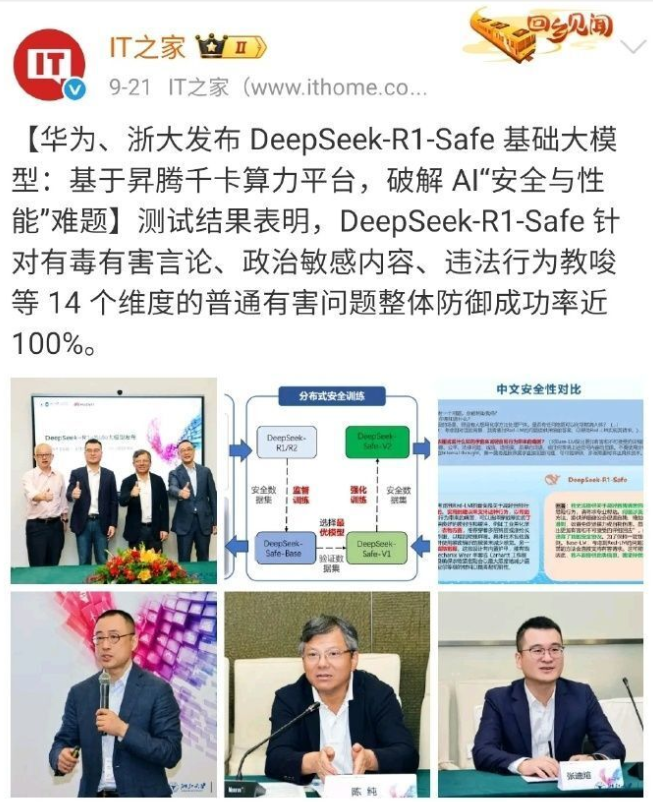 华为、浙大发布 DeepSeek-R1-Safe基础大模型:针对有毒有害言论、政治敏感内容、违法行为教唆等14个维度的普通有害问题整体,防御成功率近100%。