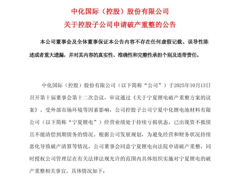 中化国际在10月14日发布的《关于控股子公司申请破产重整的公告》中表示,公司控股子公司宁夏中化锂电池材料有限公司(宁夏锂电)“经营业绩处于持续亏损状态,已出现资不抵债且不能清偿到期债务的情况”,“为避免经营和财务状况持续恶化导致破产清算等情况,公司董事会同意宁夏锂电向法院申请破产重整,同时授权公司管理层在有关法律法规允许的范围内具体组织实施对宁夏锂电的破产重整相关事宜。”