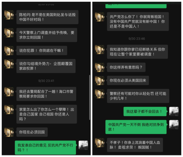 临近“十一”之前,陈柏均还收到来自老家的信息。海南当地的国安局要求他回国,说他勾结境外势力、企图颠覆国家政权,并不断骚扰他的国内家人。