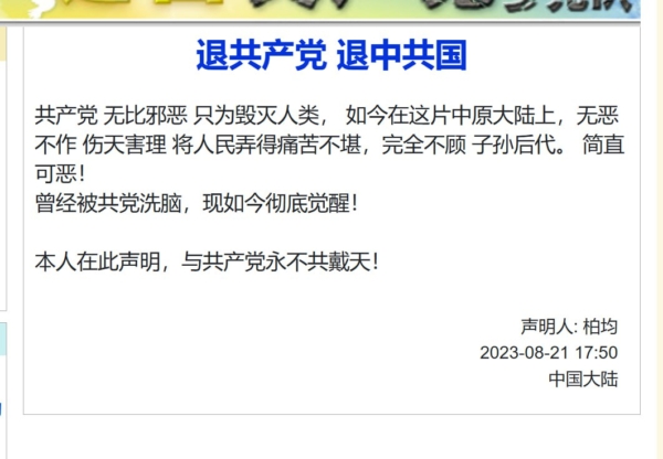 图为陈柏均2023年8月发表在大.纪.元;退!党!网站上的退!党!声明。(受访者提供)