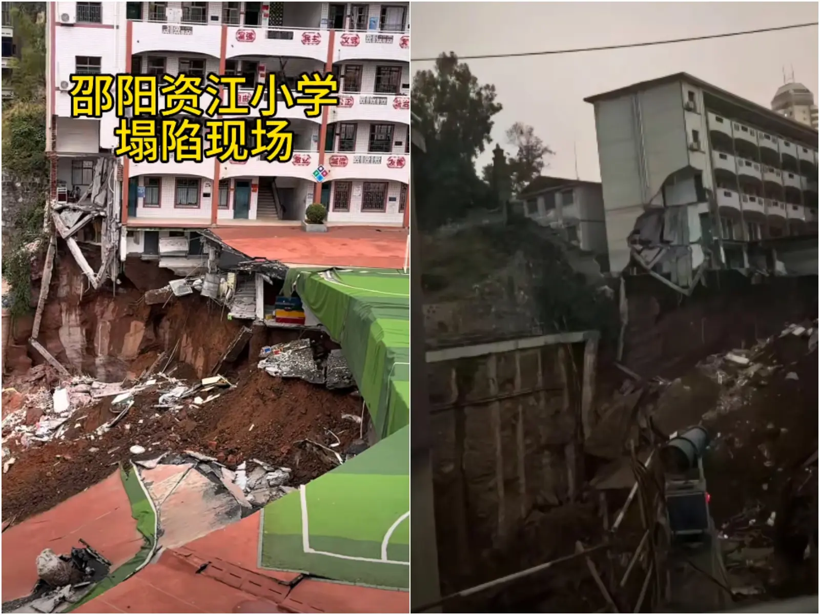 10月17日晚23时,湖南邵阳市资江学校西边围墙和操场发生坍塌,导致教学楼西侧部分墙角受损。(视频截图合成)