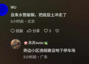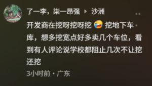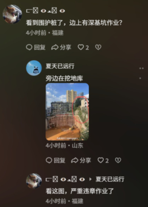 有眼尖的网友发现,“看到围护桩了,边上有深基坑作业?”有网友表示,“旁边小区违规建设地下停车场”,“看到有人评论说学校都阻止几次不让挖还挖。”