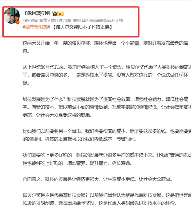 项立刚近日发表言论,称“诺贝尔奖帮不了科技发展!”
