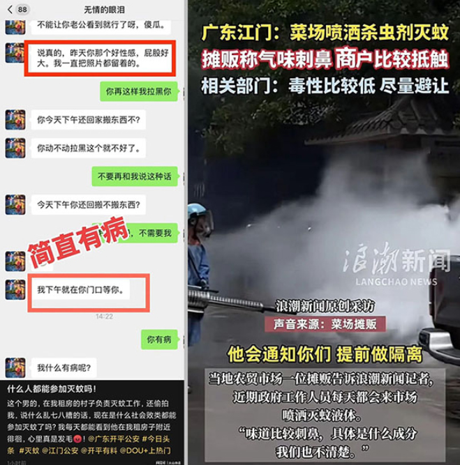 SilenceGvq:有媒体开始对江门的灭蚊加码声讨了,有防疫人员偷拍已婚女性,加人家微信进行性骚扰,趁主人睡觉,入室偷拿绿植,翻箱倒柜盗窃钱财,喷洒灭蚊药毒死猫狗,其恶行已远超当年的新冠。更有媒体大声质问:这么兴师动众灭蚊,用的是哪里的资金?如果让当地书记,街道办个人承担,它们还会这么干么?