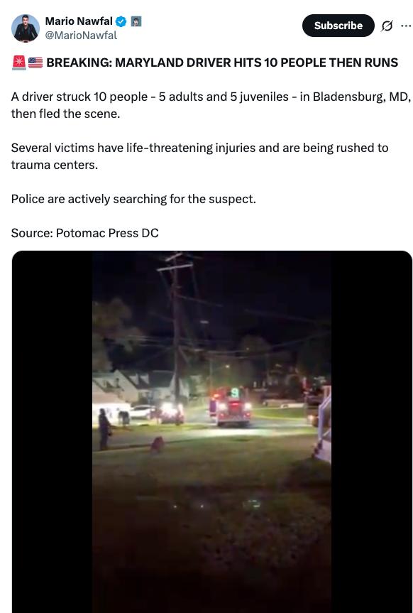 据警方称,肇事司机最初逃离了现场,但后来自首。当局指他66岁、来自华盛顿特区,但未进一步公布其身份,以及肇事原因。