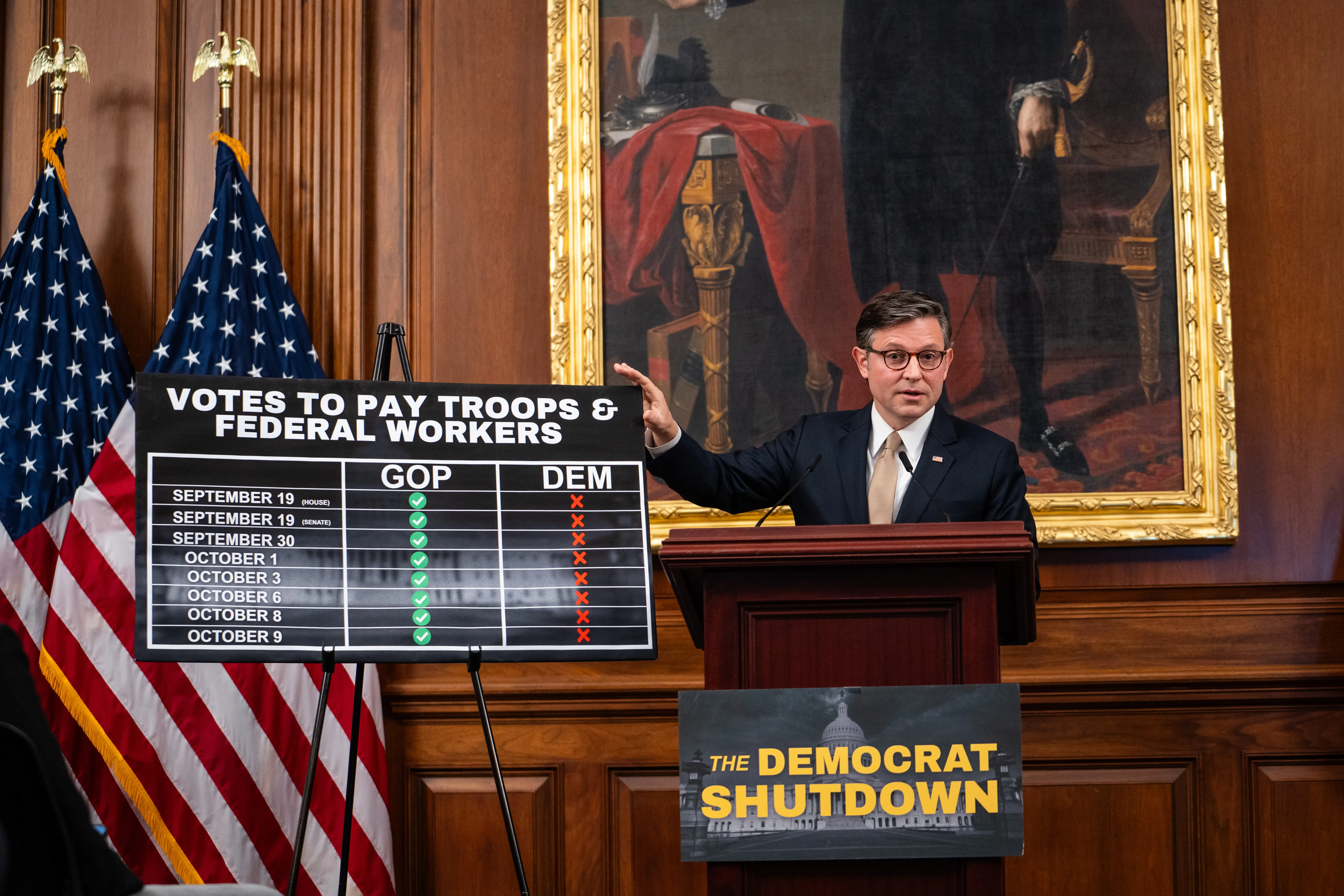 2025年10月13日,众议院议长迈克‧约翰逊(Mike Johnson)在政府停摆期间举行的新闻发布会上回答记者提问。(Madalina Kilroy/大.纪.元;)