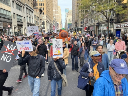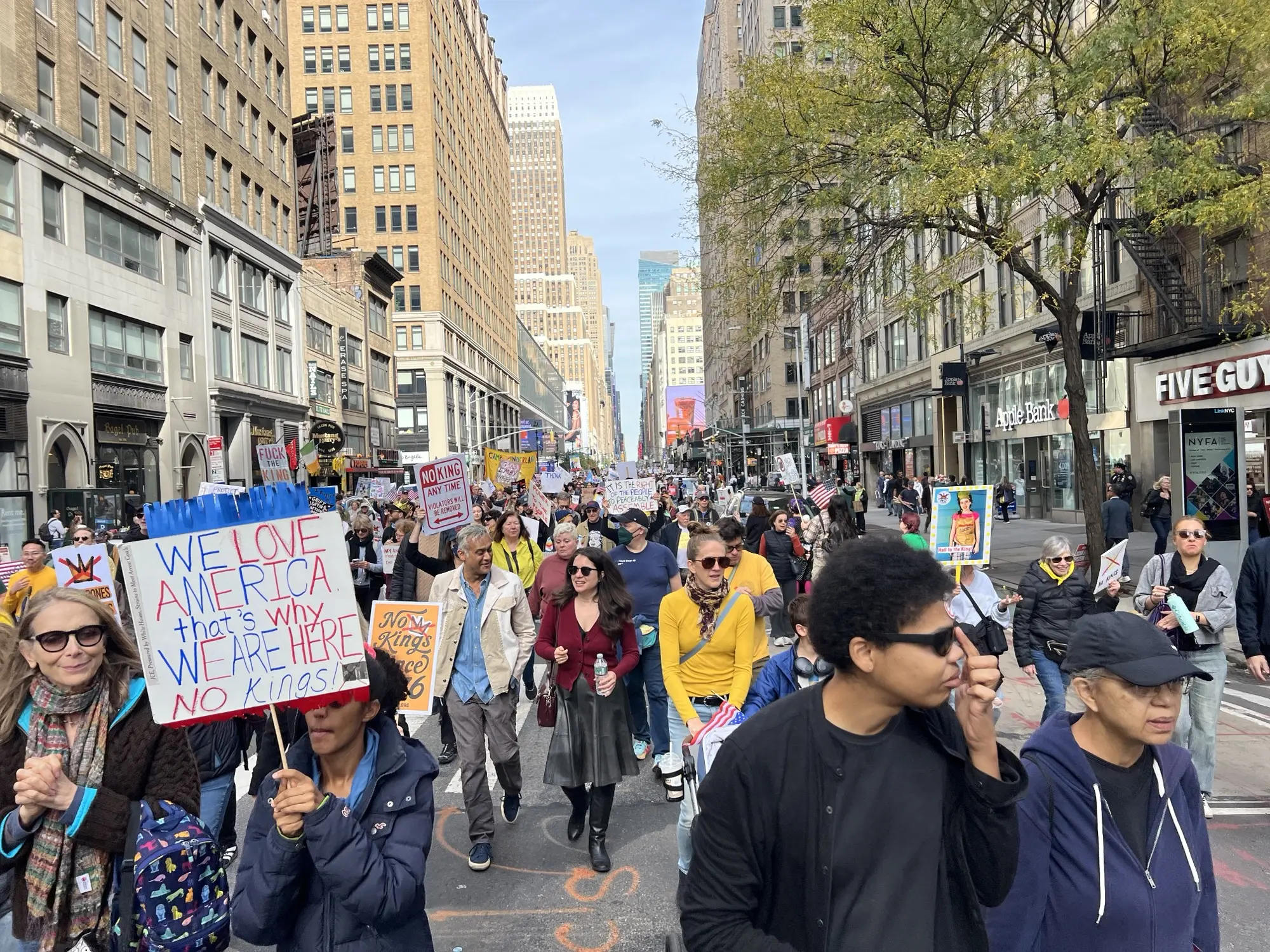 上周六(10月18日),全美多地发起“不要国王”(No Kings)游行,纽约市也是其中一个地点。活动人士从曼哈顿的达菲神父广场(Father Duffy Square)沿着第七大道和平游行至第十四街,抗议联邦政府长期关门以及总统川普部署美国移民及海关执法局(ICE)探员协助移民执法,游行大约走了2个小时。