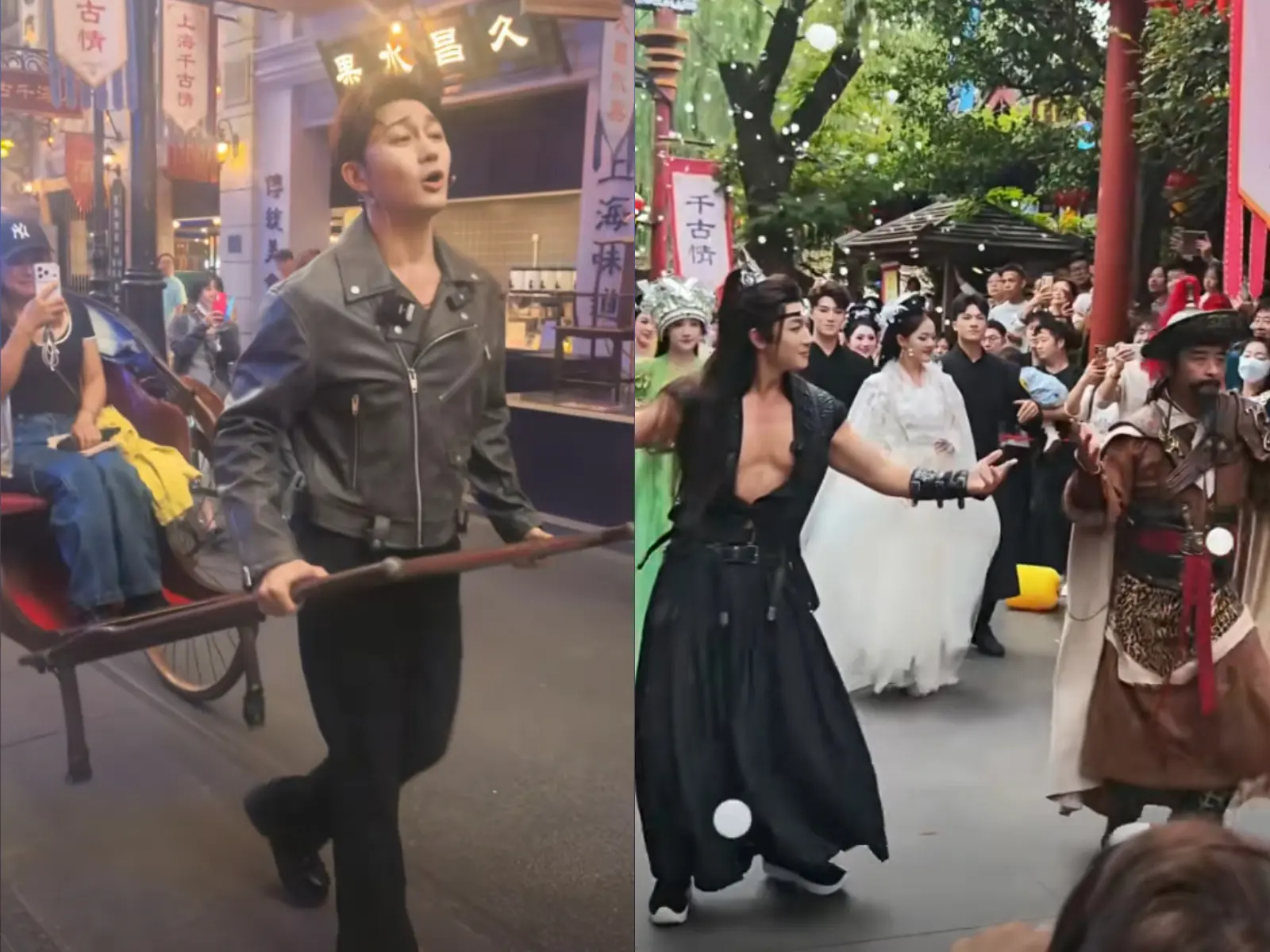 35岁男演员史元庭近期再度转行,在上海和杭州宋城等景区,当起了NPC。(视频截图合成)