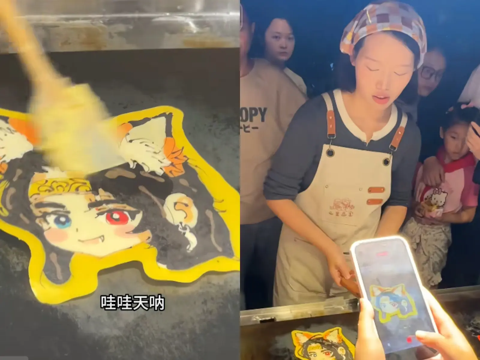 成都抚琴夜市一女摊主是美术专业出身,一次偶然的机会决定摆摊做卡通煎饼,意外在网上爆红。(视频截图合成)
