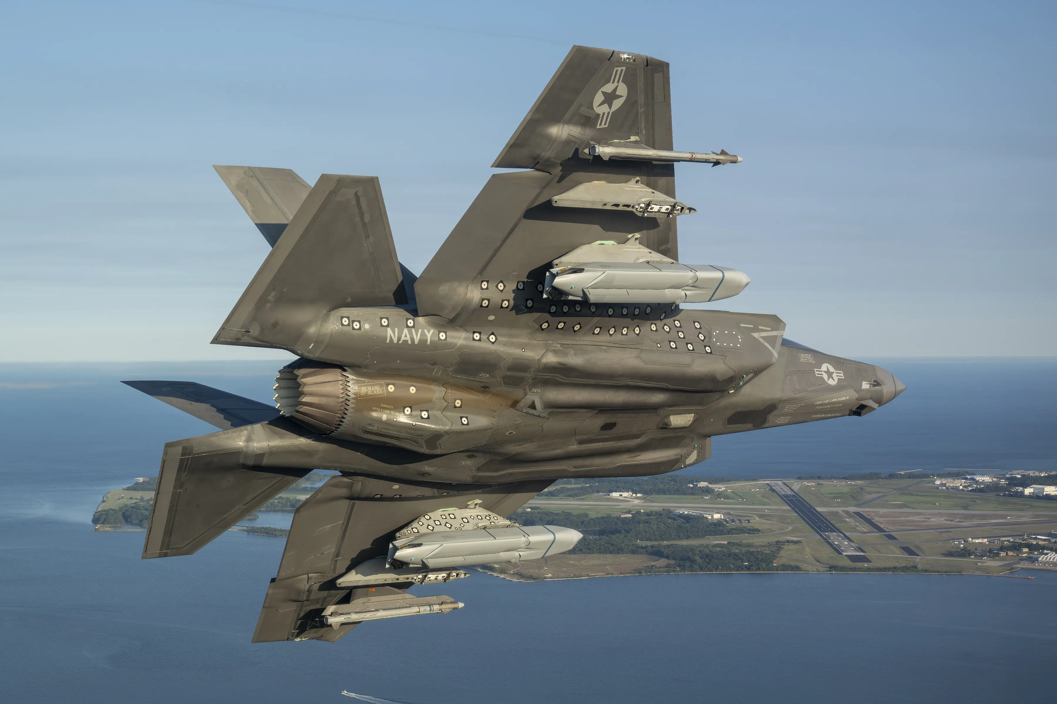 2025年10月20日,美国总统川普表示,美国的军事实力大幅领先中国。这张美国五角大楼公布的照片显示,2024年9月10日一架F-35C隐形战机携带一枚AGM-158C远程反舰导弹(LRASM),在马里兰州的帕图森河海军航空站进行试飞。(U.S. Navy/Dane Wiedmann)
