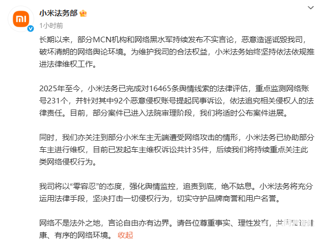 至于胡锡进文中提到的“开放社会”,有网友吐槽说中国从来就不是什么开放社会,而是一个封闭社会,因为开放社会的标志在于——公民有权质疑、社会能够纠错、权力受到约束、思想自由流动;而支撑这一切的根基,正是言论自由。也正因为缺乏这一根基,中国社会才不断上演各种魔幻现实:有车企一年两起安全事故,不但没有严肃的道歉、赔偿、召回、受罚。相反,董事长还站出来指责舆论氛围不友好有恶意,企业法务部门更宣布要以“零容忍态度强化舆情监控”,对普通人的“侵权行为”追责到底。南方周末曾发出关于成都SU7事故的报道,现在却已经无声下架。归根结底,一个封闭社会在各领域都极度敌视言论自由,用舆论管控取代公共讨论/问责,把批评看成威胁,把沉默当作稳定。在这种氛围之中,就连批评小米都可能被视为给中国汽车行业添堵、抹黑、动摇国运,最终结果又何止胡锡进所说的“不会太好、会出问题”呢?