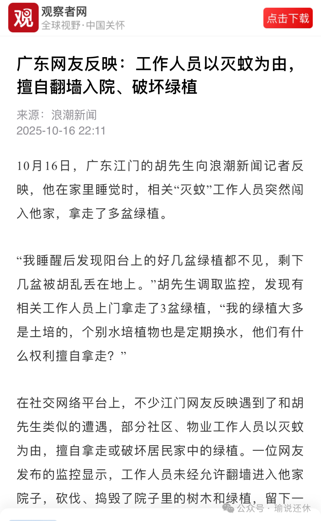 另据“浪潮新闻”称:10月16日,广东江门的胡先生称,他在家里睡觉时,相关‘灭蚊’工作人员突然闯入他家,拿走了多盆绿植……”