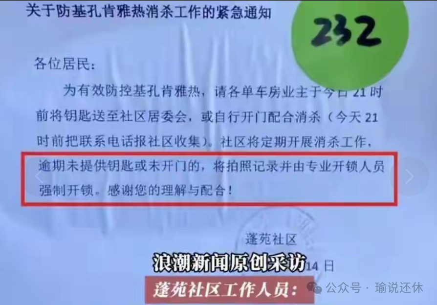 通知中如此称:“……为有效防控基孔肯雅热,请各单车房业主于今日21时前,将钥匙送至社区居委会,或自行开门配合消杀……社区将定期开展消杀工作,逾期未提供钥匙或未开门的,将拍照记录并由专业开锁人员强制开锁……”