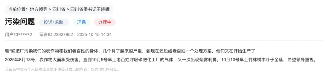 “朝*磷肥厂污染我们的农作物和我们老百姓的身体,几个月了越来越严重,到现在还没给老百姓一个处理方案,他们又在开始生产了2025年8月13号,农作物大面积受伤害,直到10月9号早上老百姓呼吸磷肥化工厂的气体,又一次出现烟雾刺鼻,10月10号早上竹林树木叶子全落,希望领导重视。”