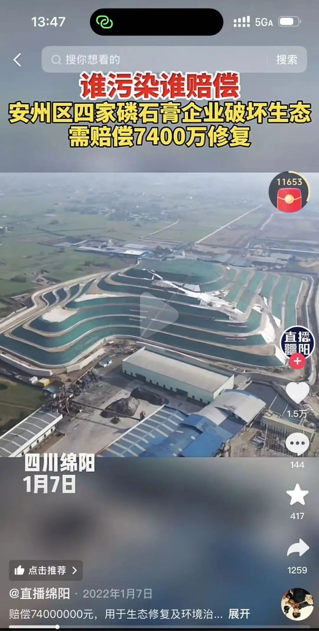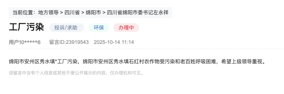 “绵阳市安州区秀水填*工厂污染,绵阳市安州区秀水填石红村农作物受污染和老百姓呼吸困难,希望上级领导重视。”