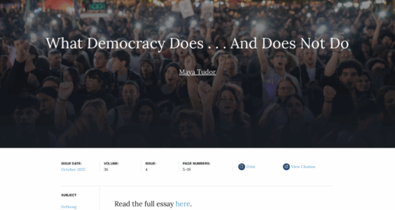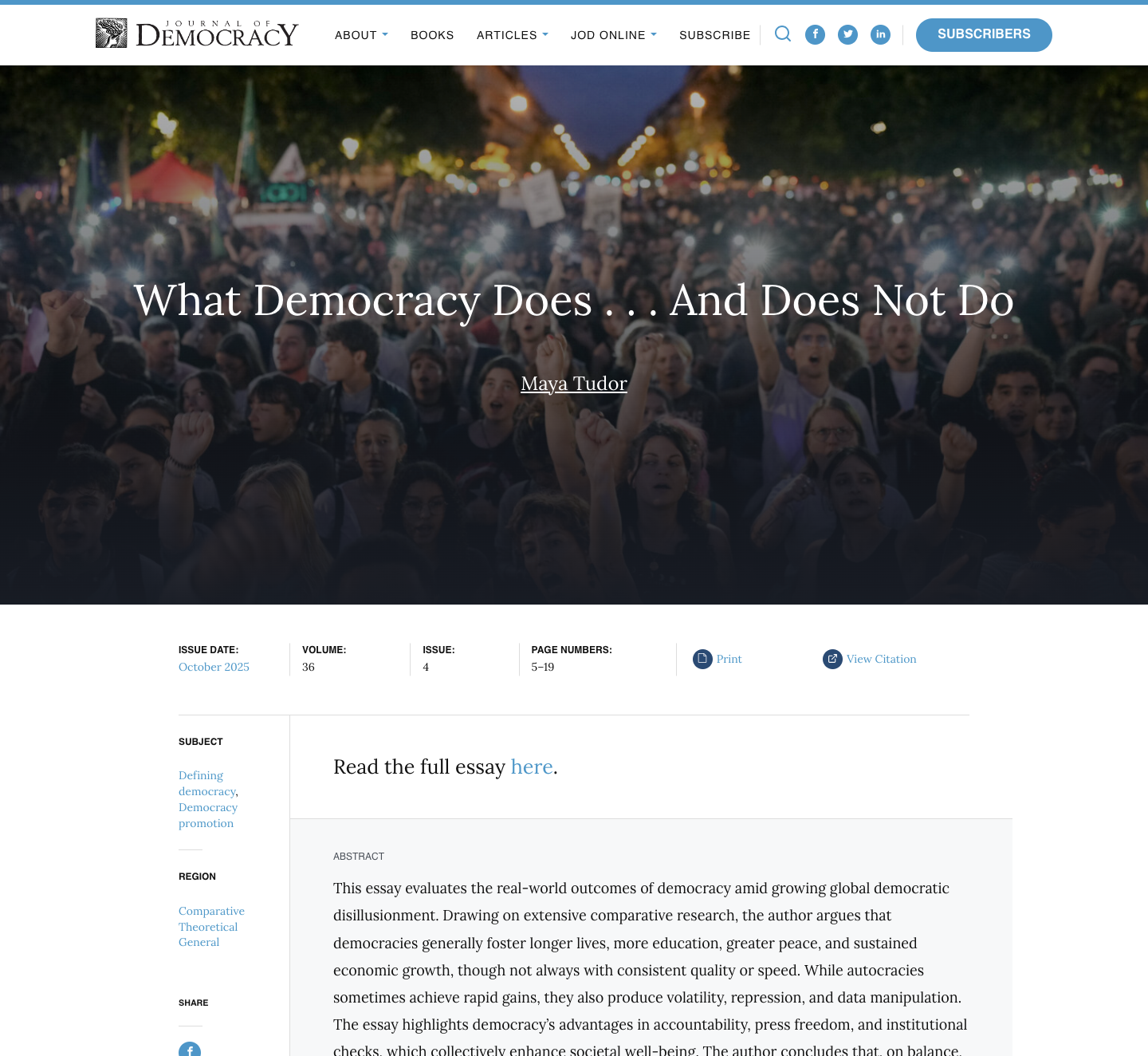 文章一开篇即点出当代焦虑:“四分之一个世纪前,民主是世界的理想,如今,它正在世界范围内受到侵蚀。”都铎指出,民众不再关注“民主是什么”,而在追问“民主能做什么”。因此,她用大篇幅综述了过去二十年中数百篇同行评审研究,指出结论非常清晰:民主在总体上比威权体制更能带来健康、教育、和平与长期繁荣。
