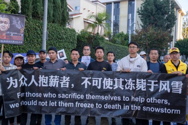 2024年10月13日民主人士在洛杉矶中国领事馆前声援彭立发先生,并呼吁共产党释放彭立发先生(作者提供)。