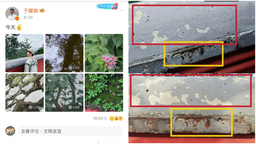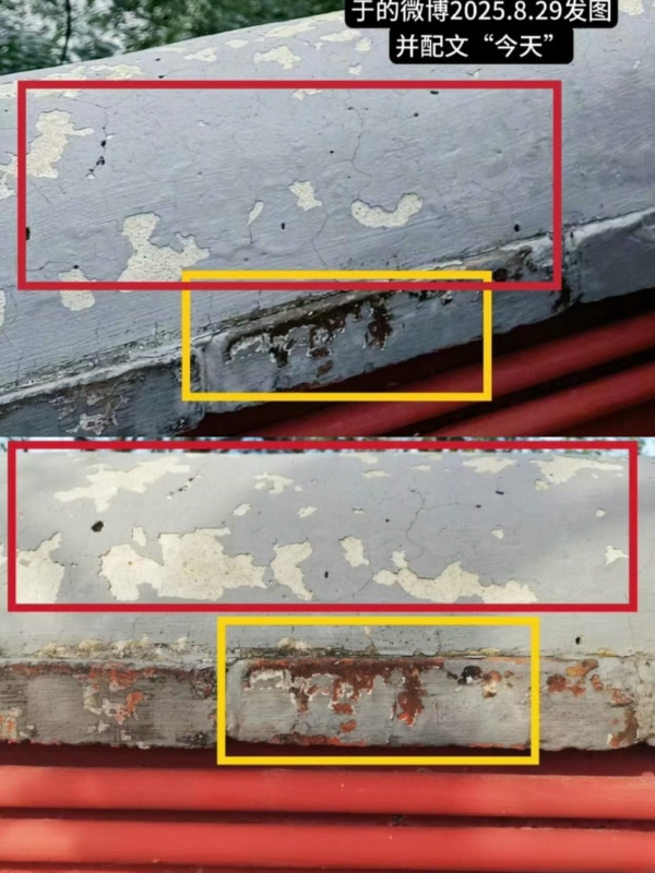 一个是通过比对发现,帖主自己拍摄的红墙和于朦胧微博照片相比,墙檐上颜料涂层脱落的面积要大很多。帖主表示,从8月29日到现在,相隔才不到两个月,墙皮不可能脱落那么多,因此可以合理质疑,于朦胧微博的照片很可能是很久之前拍摄的,并非今年8月29日。