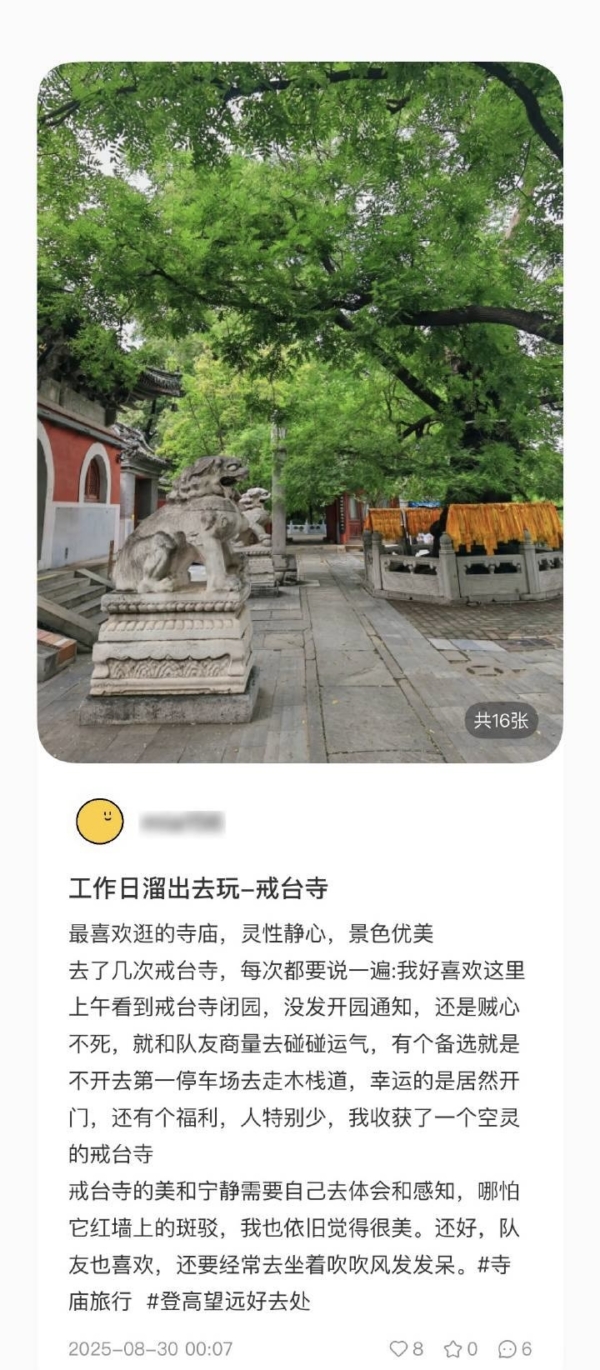 帖主还查到,网上曾有当地人发文,疑似8月29日当天到戒台寺“碰运气”,意外发现景区开门。但帖主质疑,难道于朦胧当天也碰巧去“碰运气”了?