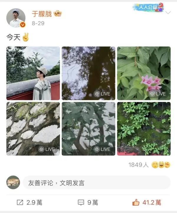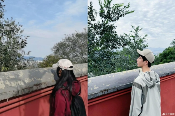 今年8月29日,于朦胧的微博发布只有两个字“今天”,并附上疑似在某景点拍摄的两张照片和四个短视频。其中一张照片,是于朦胧站在一堵红色矮墙边拍摄。网民扒出,这堵红墙位于北京戒台寺的一个停车场。