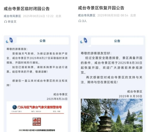 另一个疑点是,帖主通过查询发现,戒台寺景区今年8月26日因为暴雨发布闭园通知,直到8月30日才恢复开园。并且8月29日当天,北京门头沟的天气是“小雨”。但是,于朦胧微博照片中既没有下雨,也看不出刚刚停止下雨的迹象。