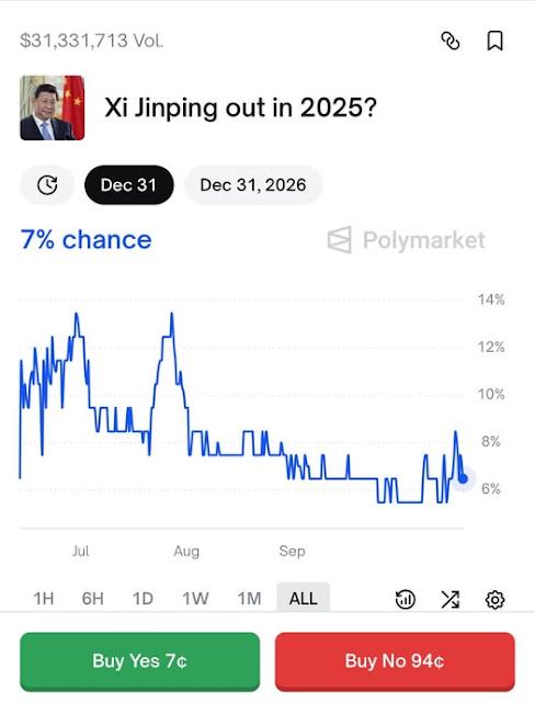 海外中国人评论圈内,几乎每日都有“听床师”绘声绘影的讲述“习*近*平被夺权”、“习*近*平快将下台”之类的消息。但如果要他们为自己的预测真金白银落注,不知道多少人愿意?美国“预测市场(prediction market)”平台Polymarket就真的有个赌盘:“Xi Jinping out in2025?(习*近*平2025年下台?)”暂时的机会是7%。以现时的赔率计算,若你押注7元,而今年之内习因任何原因失去党总书记之位,你将赢得100元。