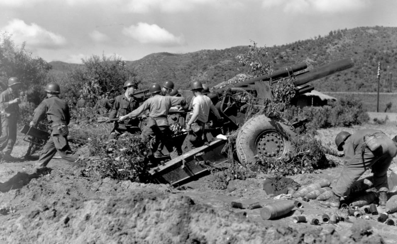 1950年7月8日,美军士兵操作155毫米榴弹炮在韩国天安地区向朝鲜军队阵地开火。(美国陆军历史中心)