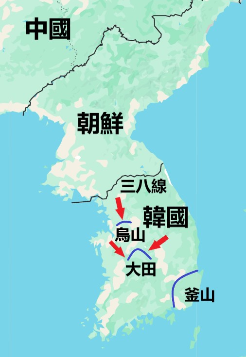 1950年7月,美军在韩国乌山和大田紧急部署防线(蓝色),阻挡朝鲜军队的进攻(红色箭头),为建立釜山防卫圈争取时间。(谷歌地图/..;制图)