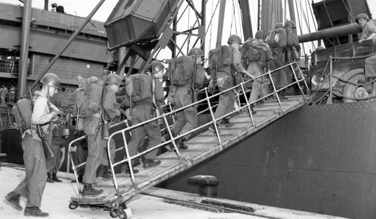 1950年7月2日,美军士兵从日本港口乘船前往韩国釜山。(美国陆军历史中心)