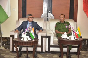 印度与缅甸近期因边境地区岛屿可能有中国驻军的问题爆发激烈冲突。图为印度国防部长辛格(左)与缅甸武装部队训练部长觉哥提克少将一起出席第二届印缅年度国防对话。图:翻摄自@SpokespersonMoD X账号