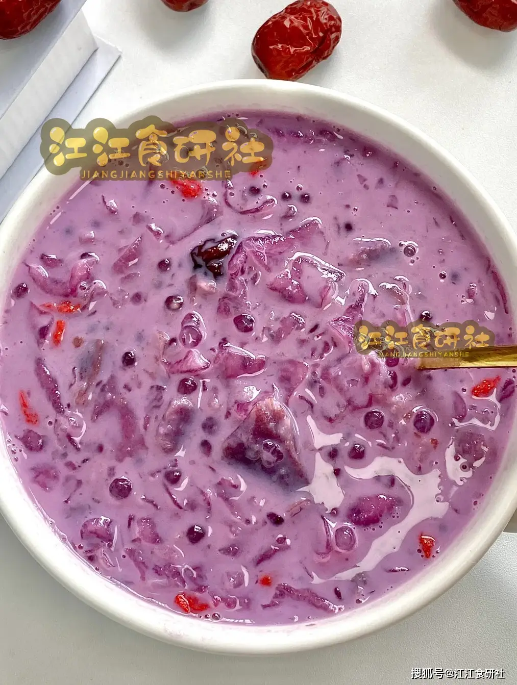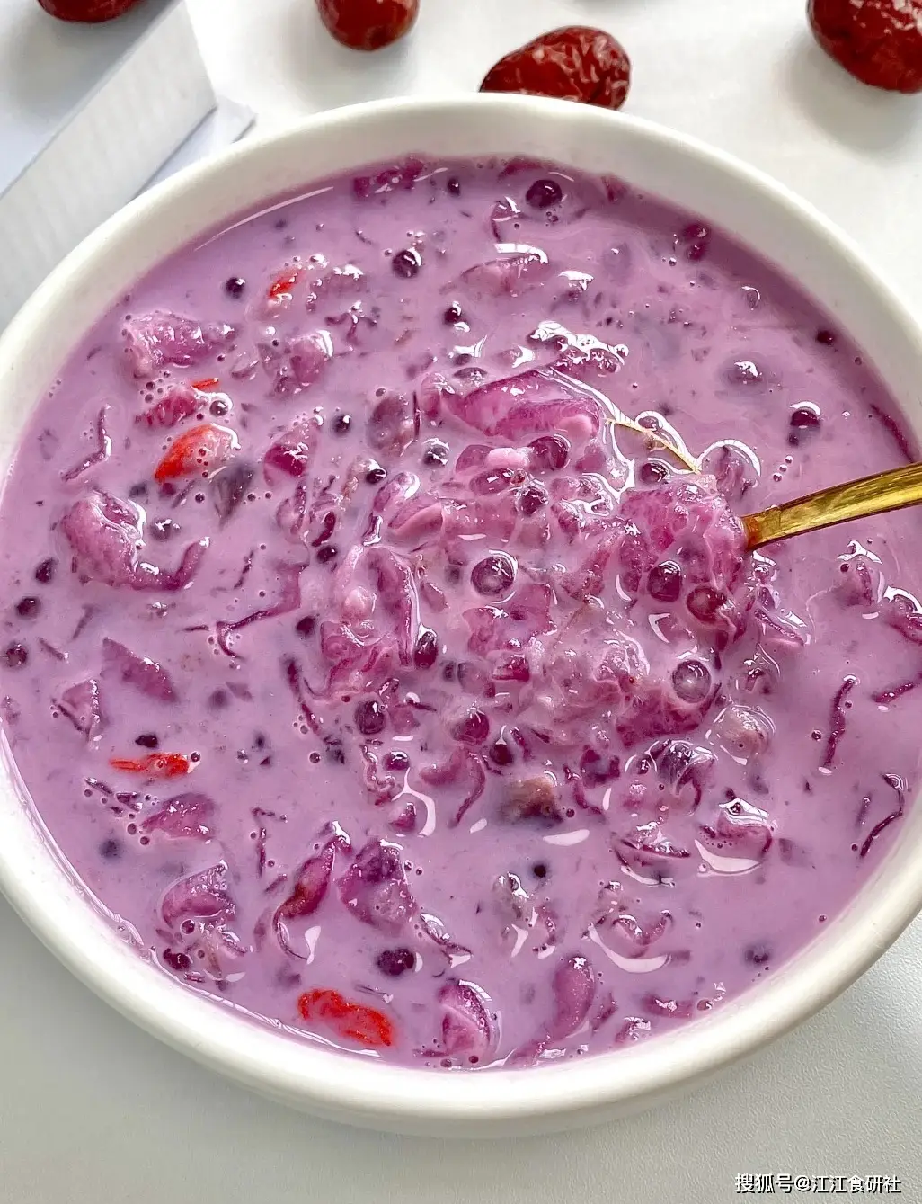 这款更像一道甜品,我家女儿超级爱喝!紫薯富含花青素,银耳和百合是滋阴润肺的好搭档,搭配Q弹的西米,颜色梦幻,味道清甜。