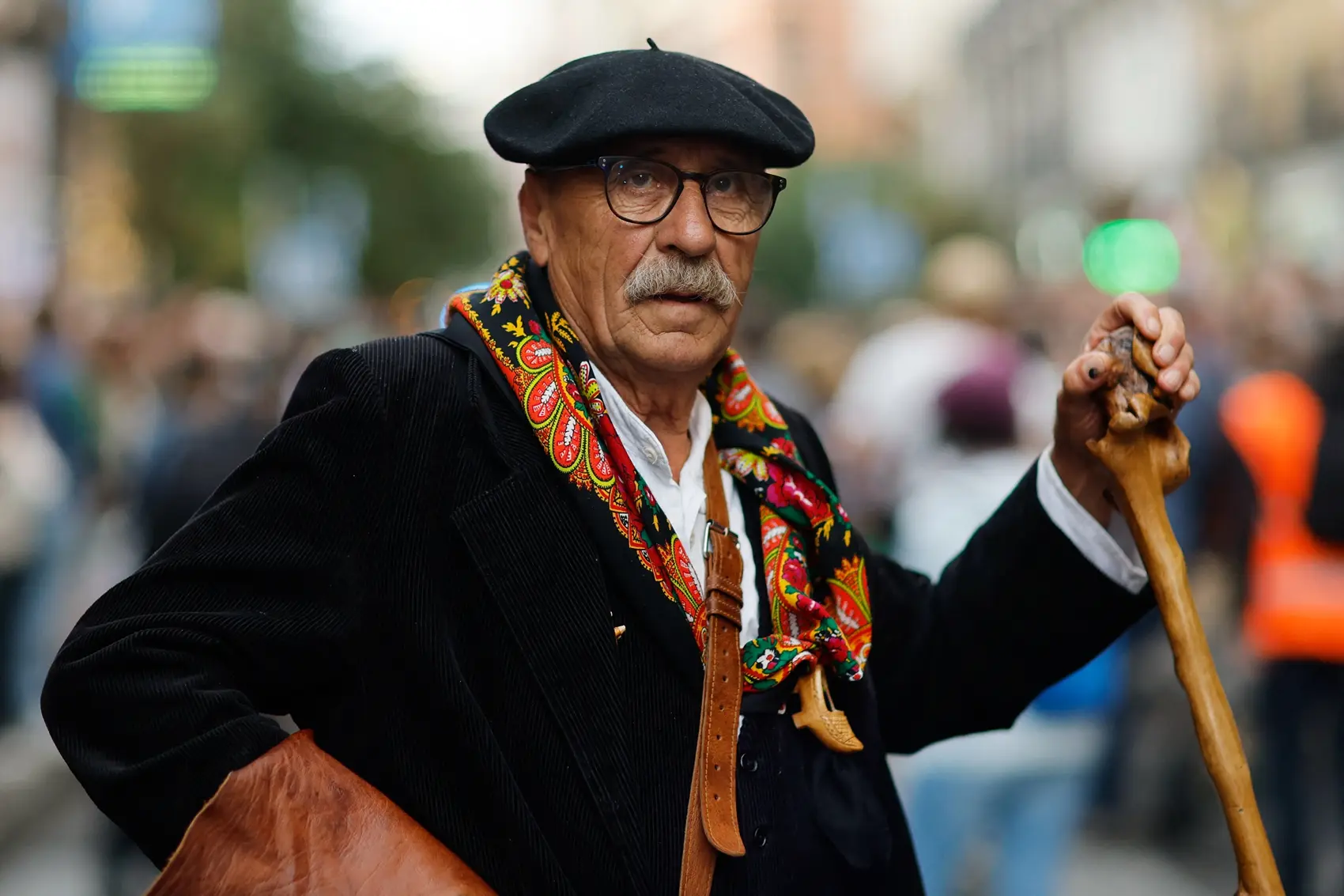 2025年10月19日,西班牙马德里迎来一年一度的游牧节,穿着传统服饰的牧羊人带领上千只羊穿越市中心的街道和广场。图为参加游牧节的一位老牧羊人。(Oscar Del Pozo/AFP via Getty Images)